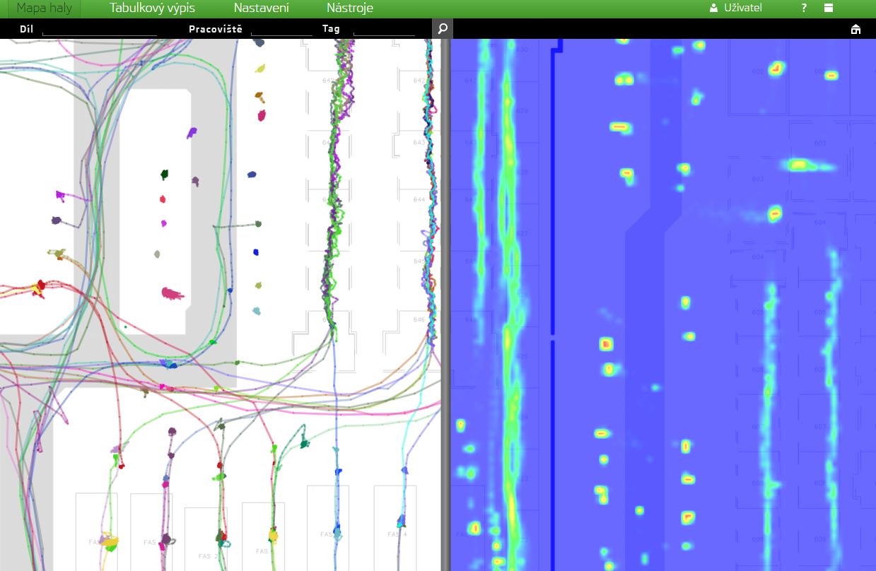 Na mapě vidíte v reálném čase, kde se který pracovník (TAG) nachází i s mnoha dalšími parametry.