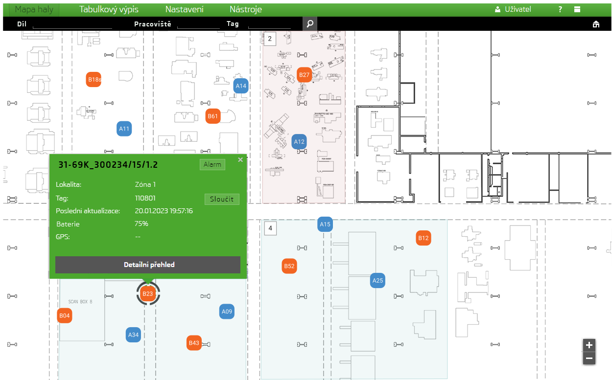 Na mapě vidíte v reálném čase, kde se který pracovník (TAG) nachází i s mnoha dalšími parametry.